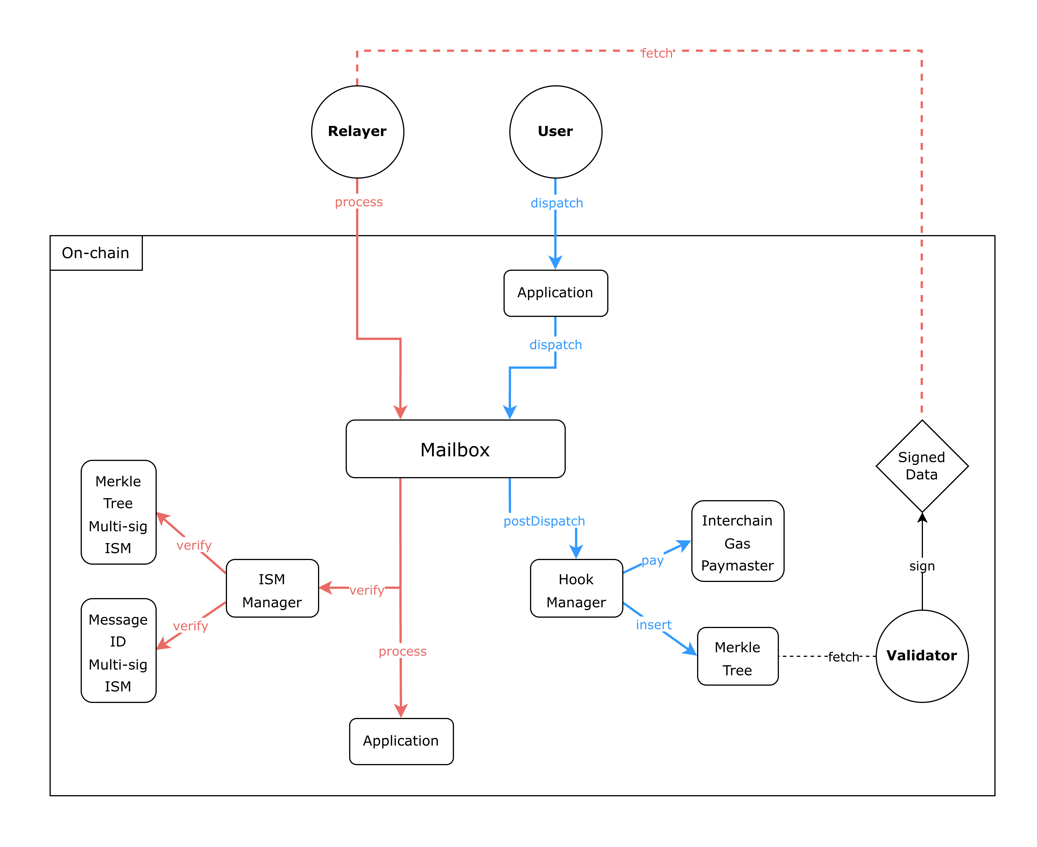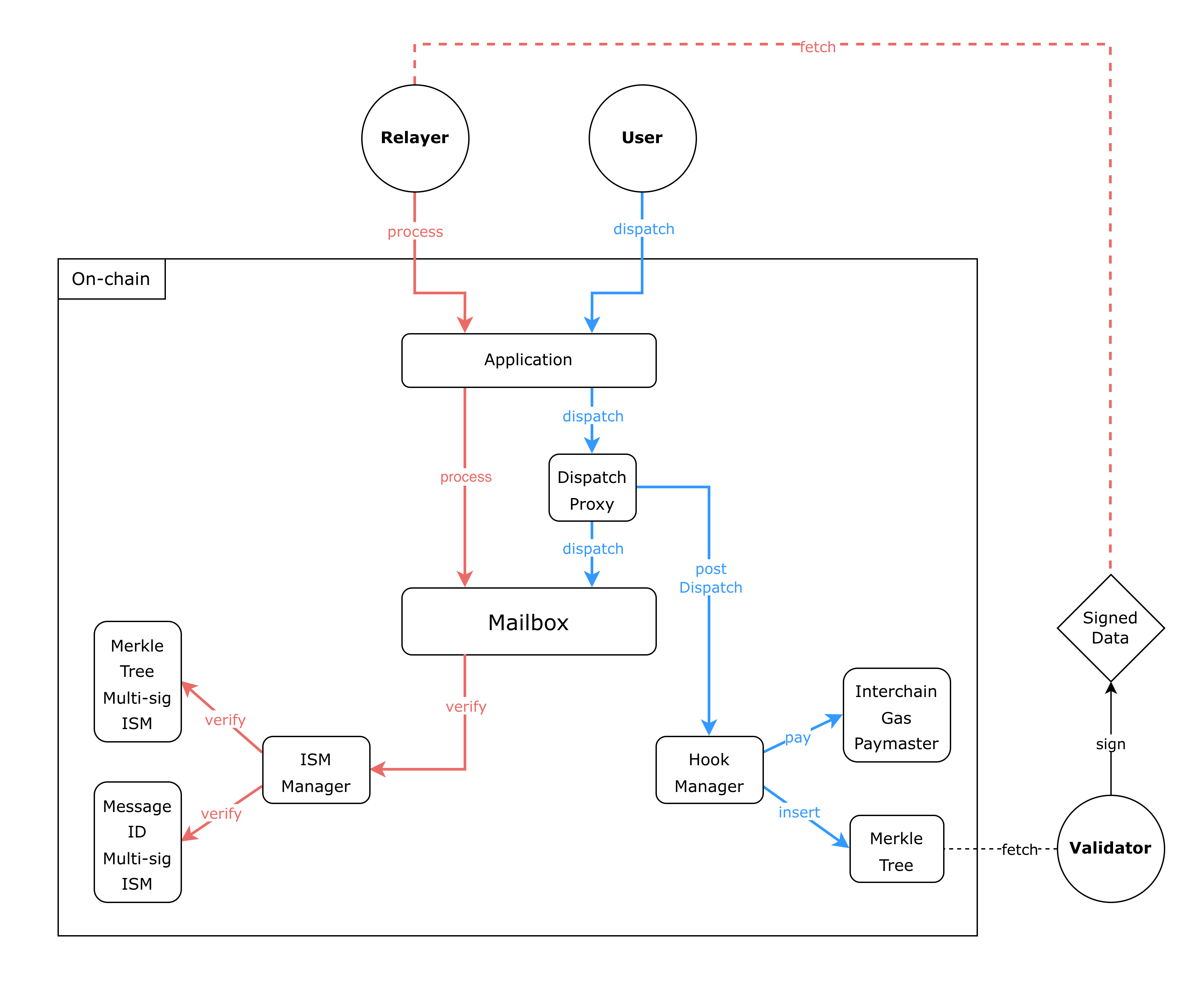 There are two main flows in the protocol: the first is the “dispatch” flow, which is used to dispatch a message from Chain A (origin) to Chain B (destination). The second is the “process” flow, which is used to process the same message on Chain B using a custom verification logic.
